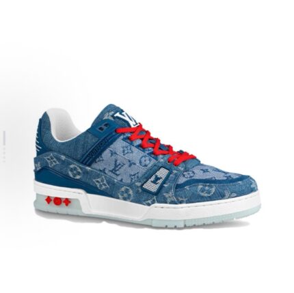 The LV Trainer is a denim LVers Damier pattern designed by menswear art director Pharrell Williams. The Vuitton logo and LV letters are integrated into the industrial upper, and the delicate outsole is lit by Monogram flowers. The original design was created by Virgil Abloh and is inspired by retro basketball shoes