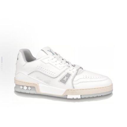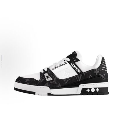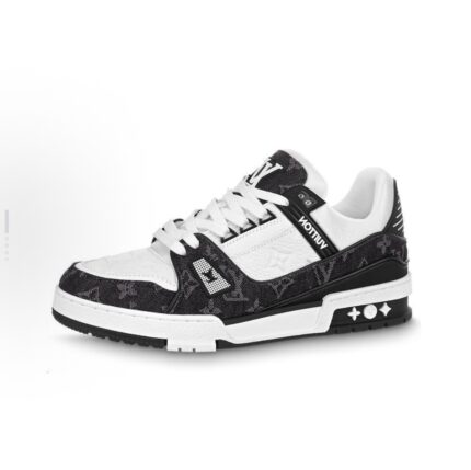 The LV Trainer comes from Monogram denim and Monogram grain cattle leather. The original design was by Virgil Abloh. Complex upper and various brand elements enhance recognition. LV letters light up the tongue and back of the shoe, and Monogram flowers bloom on the technological rubber outsole