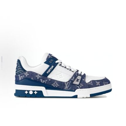 The LV Trainer is a denim LVers Damier pattern designed by menswear art director Pharrell Williams. The Vuitton logo and LV letters are integrated into the industrial upper, and the delicate outsole is lit by Monogram flowers. The original design was created by Virgil Abloh and is inspired by retro basketball shoes