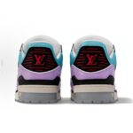 This LV Trainer sports shoe combines smooth cow leather with industrial perforation, cleverly interpreting the inspiration of retro basketball shoes. The complex upper continues the classic structure, with Monogram floral and asymmetrical Louis and Vuitton logos dividing the sides and rear.