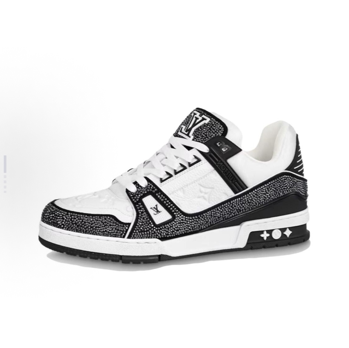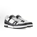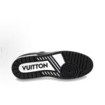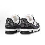 This LV Trainer sports shoe combines smooth cow leather with industrial perforation, cleverly interpreting the inspiration of retro basketball shoes. The complex upper continues the classic structure, with Monogram floral and asymmetrical Louis and Vuitton logos dividing the sides and rear.